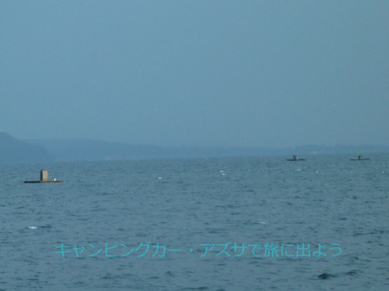 石川県道257号で海沿いを行く。5分も行くと、海の中に小さな船が多数浮かんでいた。どの船も真ん中に大きな四角い箱を載せている。その船に人影は見えない。