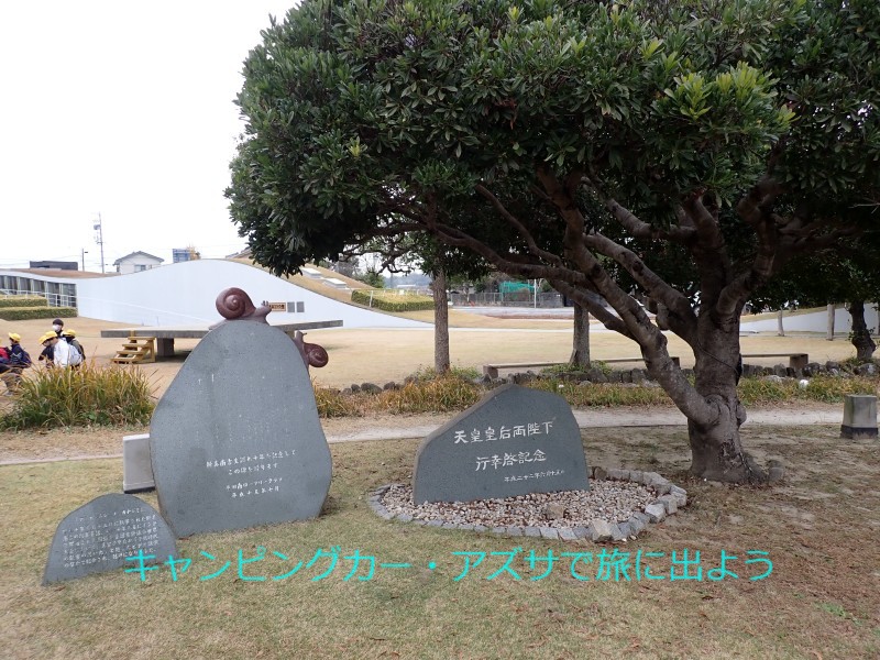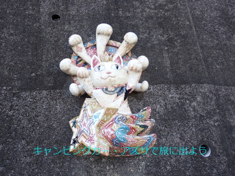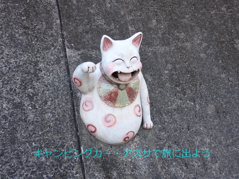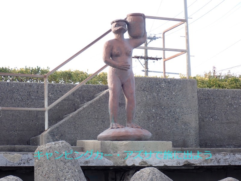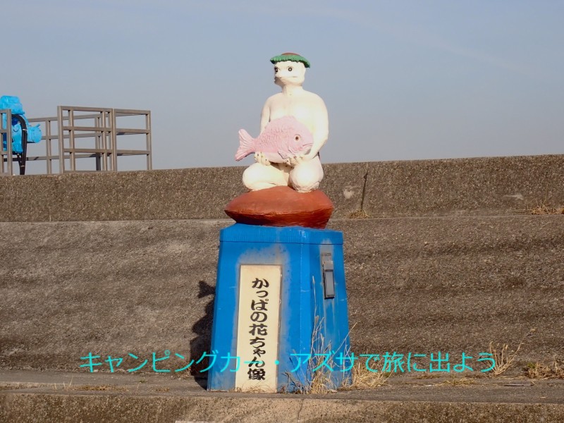 | さぁ3体目の河童の像に会いに行こう。野間海水浴場にあるらしい。海水浴場には4分で到着。でも河童の像は見当たらない。少し行くとRVパーク・野間海岸ステーションがあった。さらに進むと道路は空き地で行き止まり。そこに右のこぶしを突き上げて、海ではなくこちらを向いて立っていた。「野間太郎父ちゃんかっぱ」だ。口をへの字に曲げてこんな端っこにいても「俺は頑張ってるぞ」と言いたげにこちらを見つめている。さすが父ちゃん。このくるま旅で必ず巡るとしていた目的は達成。 |
