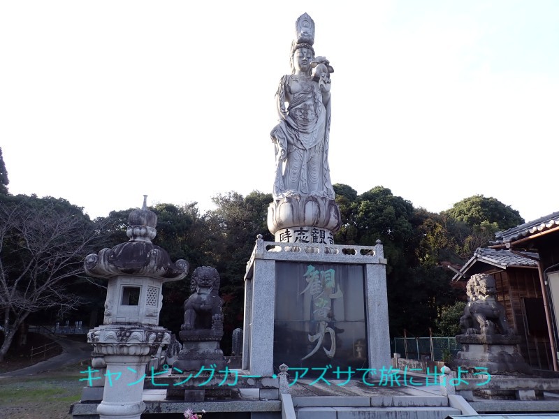 | 時志観音影現寺へ向かう。7分ほど行くと国道247号沿いに1体目の河童の像「花ちゃん娘カッパ」がある。大きな鯛を両手で抱えている。写真を撮ってすぐに出発。ここから2分で影現寺。国道から狭い脇道へ。「こんな急坂、行って大丈夫かな」と思いながら登りきると広い駐車場があって一安心。この地方では安産祈願で有名。駐車場の正面に本堂と傍らに大きな観音様が立っておられる。左手に持った蓮の花をじっと見つめている様に見える。台座には「観音力」の文字。調べてみたら蓮の花は尊い仏の悟り、観音力は苦境に向き合う力とあった。 |