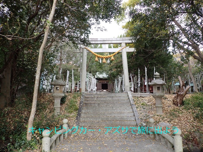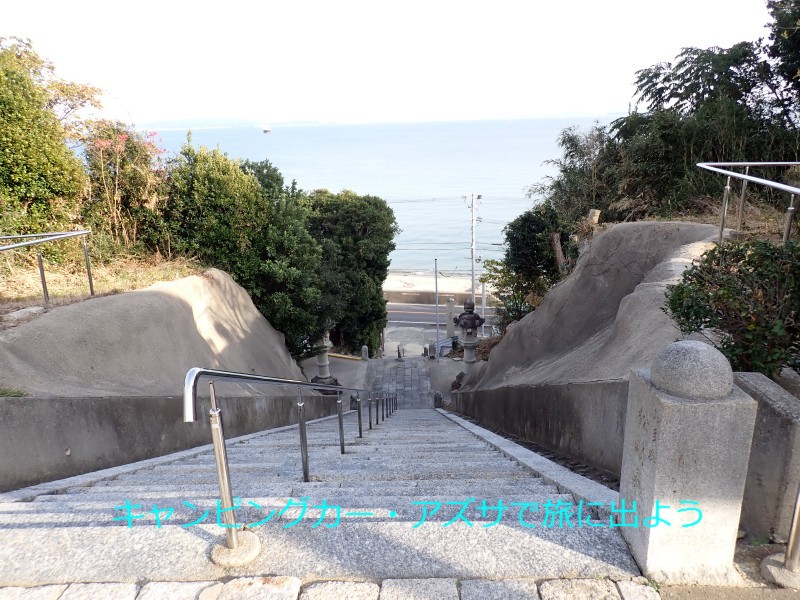 羽豆岬の羽豆神社へ向かう。16分で到着。神社へは表参道と東参道の二つある中の東参道を行く。距離が短いから。入口は師崎港フェリーターミナルの奥にある朱色の大鳥居。本殿までは石段が続いている。数えながら登ったら108段だった。正式には何段かな。