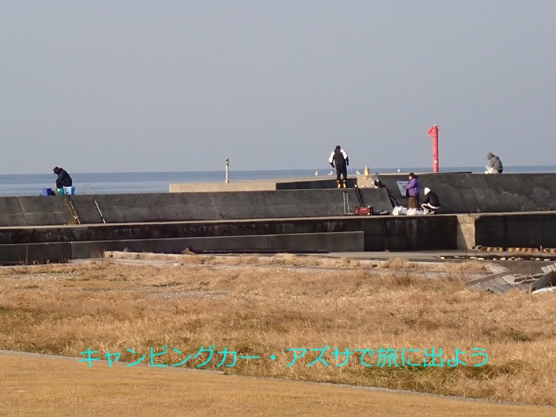 昨夜はアズサだけだった駐車場。今朝は乗用車が2台止まっていた。堤防を見ると釣り人が5人ほど。何が釣れるのかな。