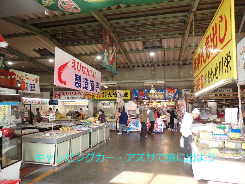 豊浜魚ひろばへ向かう。11分で到着。豊浜漁港にあり新鮮な魚介類や水産加工品を値打ちに販売している。知多は海老せんべいの製造販売も盛んで、ここにも2軒出店している。妻は「どうせ割って食べるんだから」と徳用われせんを3袋も買っていた。 |