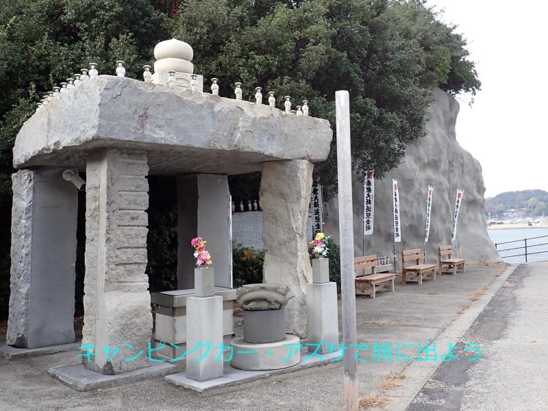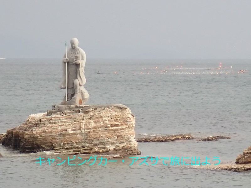 聖崎公園に向かう。弘法大師の上陸大師像がある。諸国行脚の折り、三河から知多半島へ船で渡られここに上陸したらしい。12分で到着。大師は海面に突き出した双子岩の上に立ち、左足を岩に掛けて上陸しようとされている。周辺を散策してから魚太郎本店へ向かう。 |