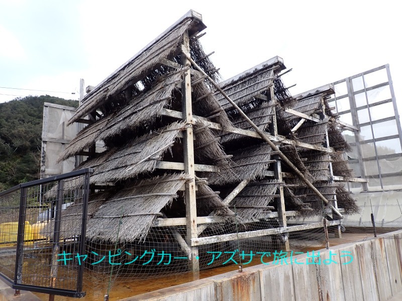 まちの駅・食と健康の館へ向かう。25分で到着。ここは製塩所を併設している。海水を濃縮するための流下式枝条架塩田の稼働を見たくて立ち寄ったが、この季節は製塩していないようだ。