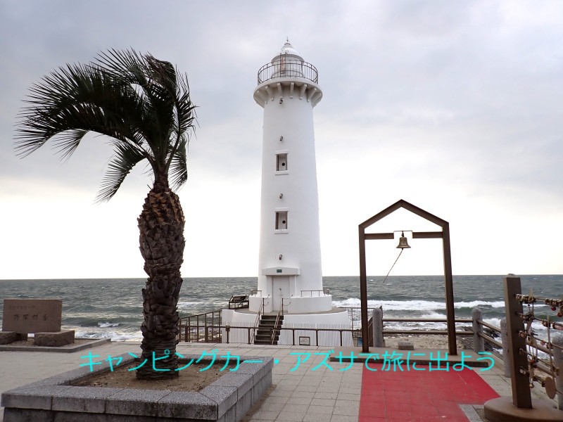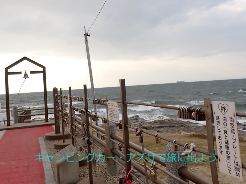ここから300mほど行くと恋人たちの聖地・野間崎灯台。風が強く海は白波が立っている。恋人同士がモニュメント「絆の音色」に南京錠を掛けると恋愛が成就すると言われているがさすがに誰もいなかった。写真を撮ってすぐに出発。 |