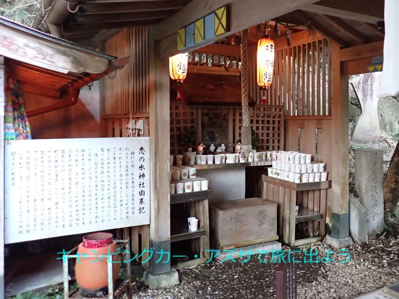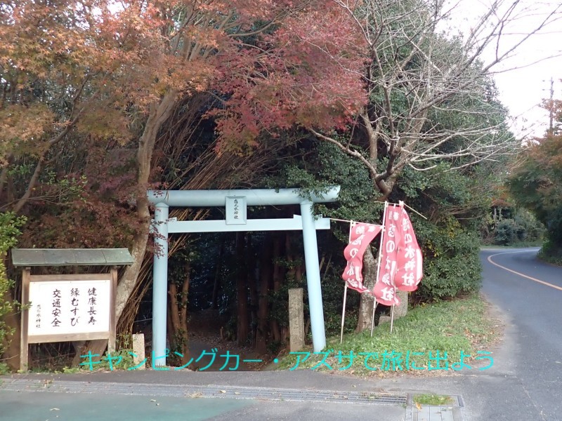 | 恋の水神社へ向かう。9分で到着。道路脇に駐車スペースと空色の鳥居があり、そこから坂を下って行くと神社がある。御神徳は健康長寿・縁結び・交通安全と案内板に書かれていた。この中で最も注目されているのは縁結び。「お参りすれば恋が叶う」と言われ、特に若い女性に人気だ。 |