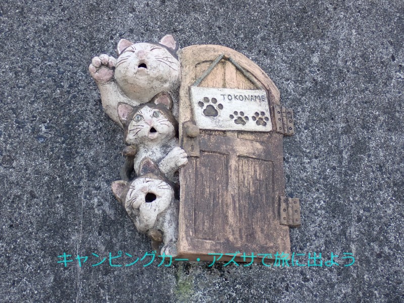 8時20分に出発。常滑市陶磁器会館へ向かう。古くからの窯業施設などを散策する「やきもの散歩道」の起点で、駐車場が平日無料(R6年2月1日より全日有料に変更)で利用できる。28分で到着。ここを散策するには坂が多くて幾分の体力は必要だ。とこなめ招き猫通りには陶器製のユニークな猫たちが道路沿いの壁面に張り付いている。その壁面の上には高さ3.8mの巨大招き猫「とこなめ見守り猫とこにゃん」が顔を覗かせていた。 |