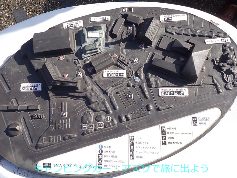 | INAXライブミュージアムへ向かう。12分で到着。説明によると「土とやきものの歴史や文化、美しさや楽しさを伝える活動を展開」とあった。世界のタイル博物館などの施設が6館あり、入場にはチケットが必要。シニア割引があり安く入場出来た。園内で施設外観などを見るだけならチケットは不要だ。 |