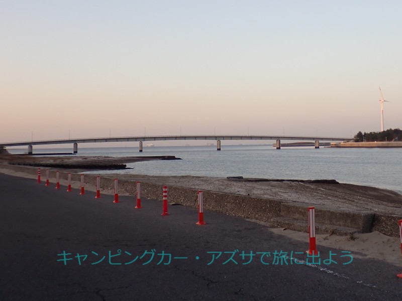 | 今夜お世話になる新舞子の郷戸広場駐車場へ向かう。11分で到着。すぐ前の浜で釣りやウインドサーフィンなどのマリンスポーツが楽しめる。実を言うと自宅はここから20分圏内。でもここで1泊して次の日の明るい時に帰った方が、体も楽で気分も良い。 |